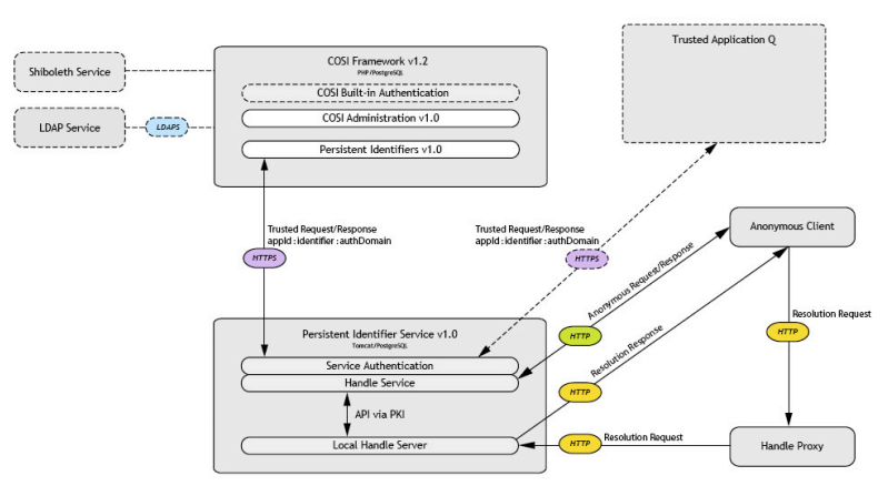 Handle service has a single trusted client application, Persistent Identifiers v1.0, implemented under the COSI framework which provides a user interface (UI) for self-service identifier management.