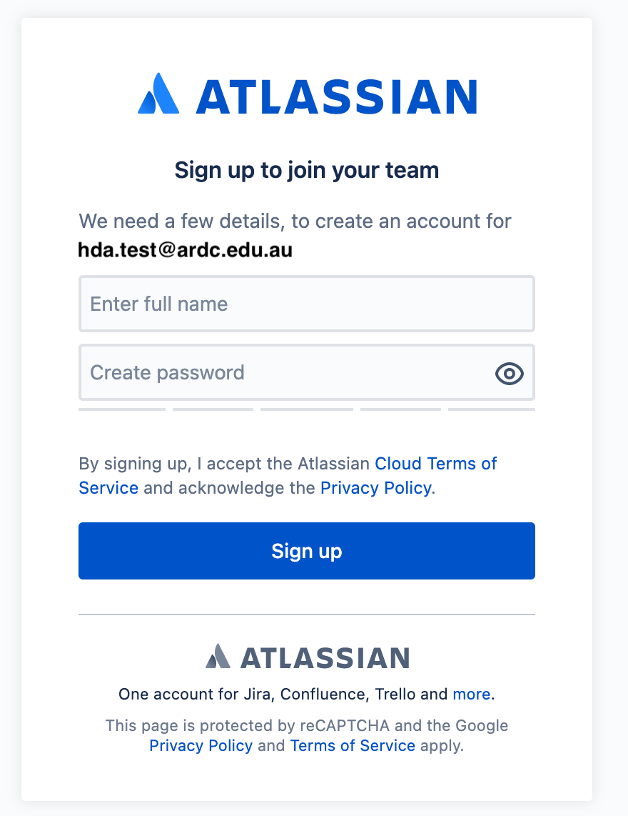 The next screen will ask you to complete your login registration for the POC email address specified in the HDA Data Request account creation request (see 'your HDA Data Request account'). Enter your Full Name and password then click ' Sign up