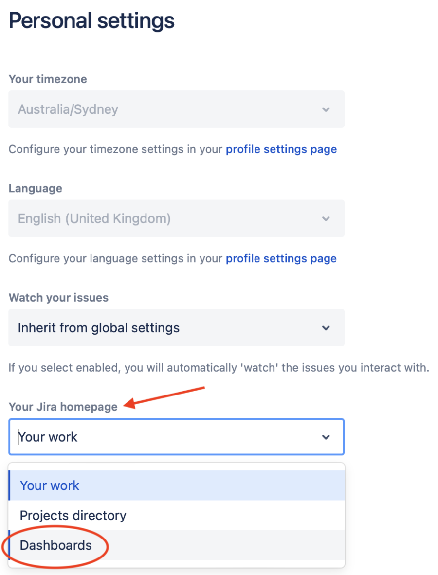 On 'Your Jira homepage section, select 'Dashboards from the drop-down list