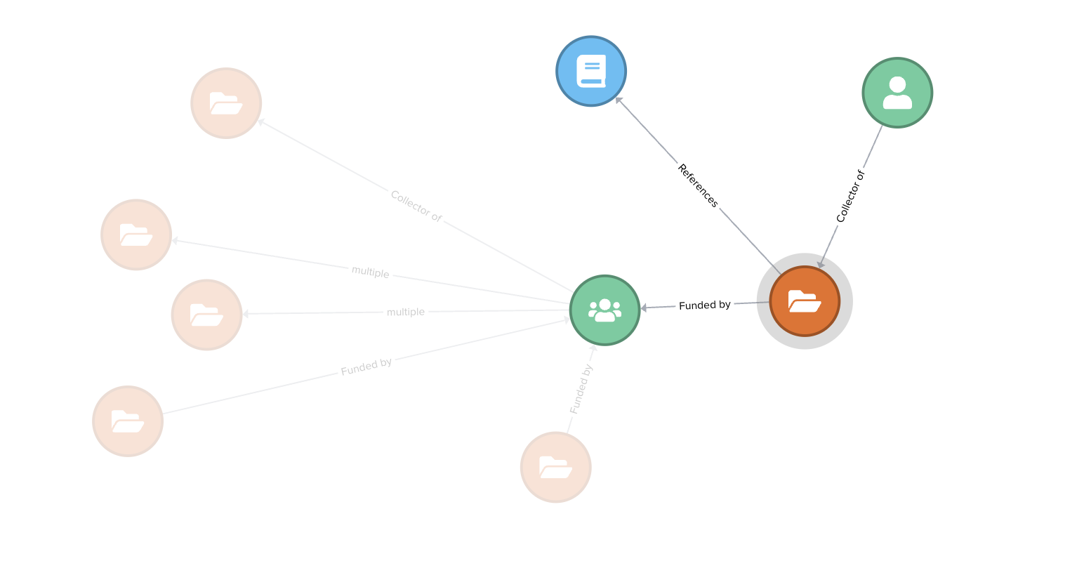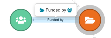 If the text on the connector says "multiple," it indicates that the two vertices are linked through more than one relation. An example is provided below to illustrate the relationships between an organisation and a dataset. In this case, the dataset is both funded by and available through the organisation it points to.