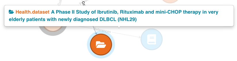 To view a vertex's type and title, hover your cursor over the vertex. This action will trigger a tooltip displaying the respective values. Where a health dataset exists in Health Data Australia, the title of the vertex will be displayed as a hyperlink. Simply click the link to view the information about the dataset in HDA.