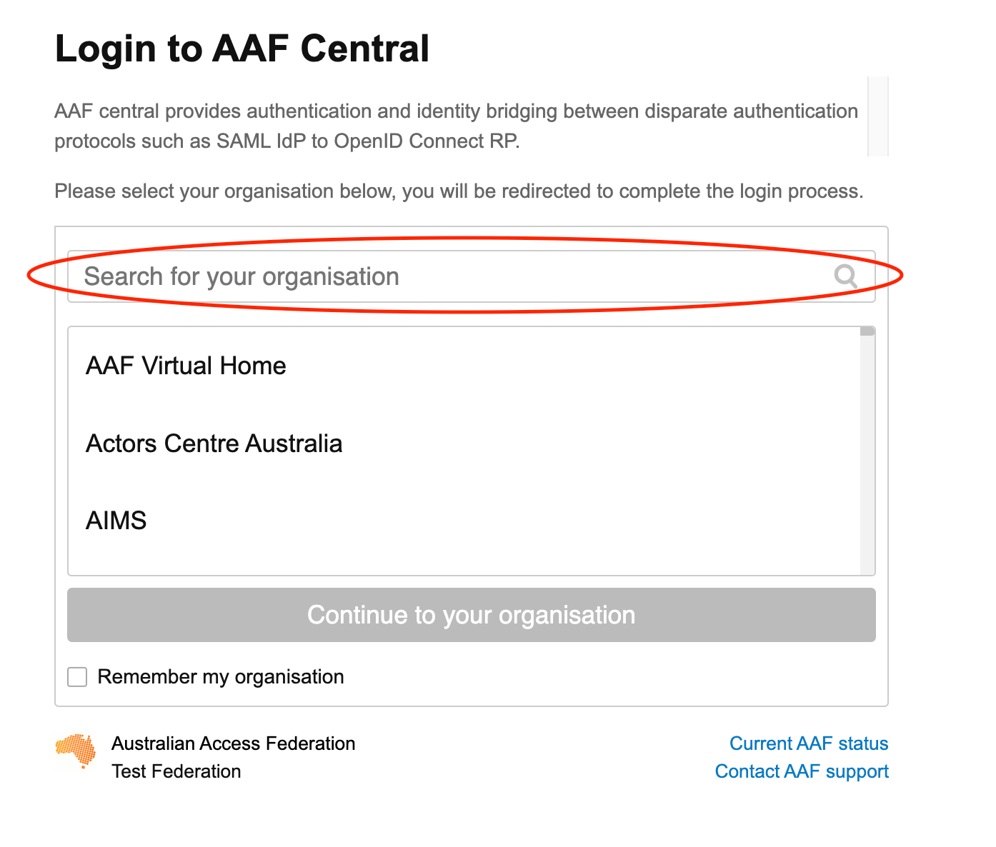 On the AAF Central login page, you will see a list of organisations that are part of the AAF network. Find and select the organisation that you're affiliated with from the list.