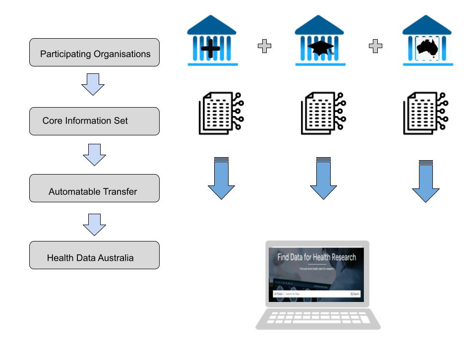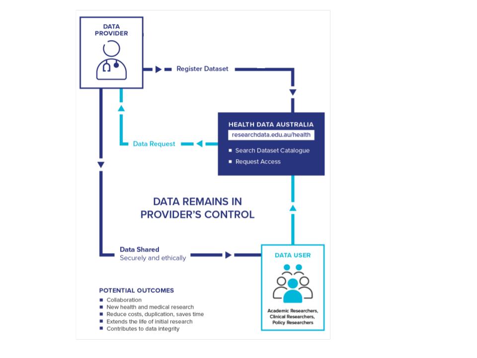Health data holders share descriptions of their data, which are then made discoverable in the Health Data Australia portal. Health Data Australia only contains metadata records for the data; it does not store the data itself. Contributors retain control over access to the data, however there is an expectation that the data can be made available to researchers (provided appropriate conditions are met).