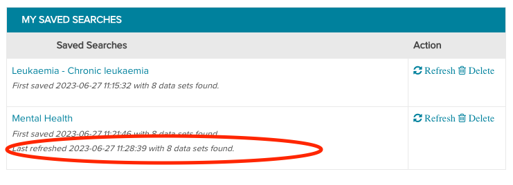 Refreshing a saved search allows you to check if there are any new health datasets that match the saved search criteria. To refresh a saved search, simply click the "Refresh" button on the same row.
