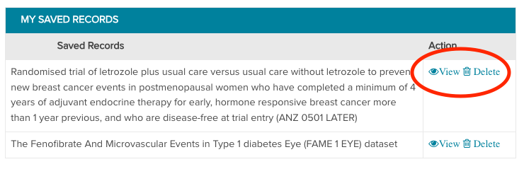 You will find the corresponding entry in the "My Saved Records" table with 2 action buttons in the same row: View and Delete.