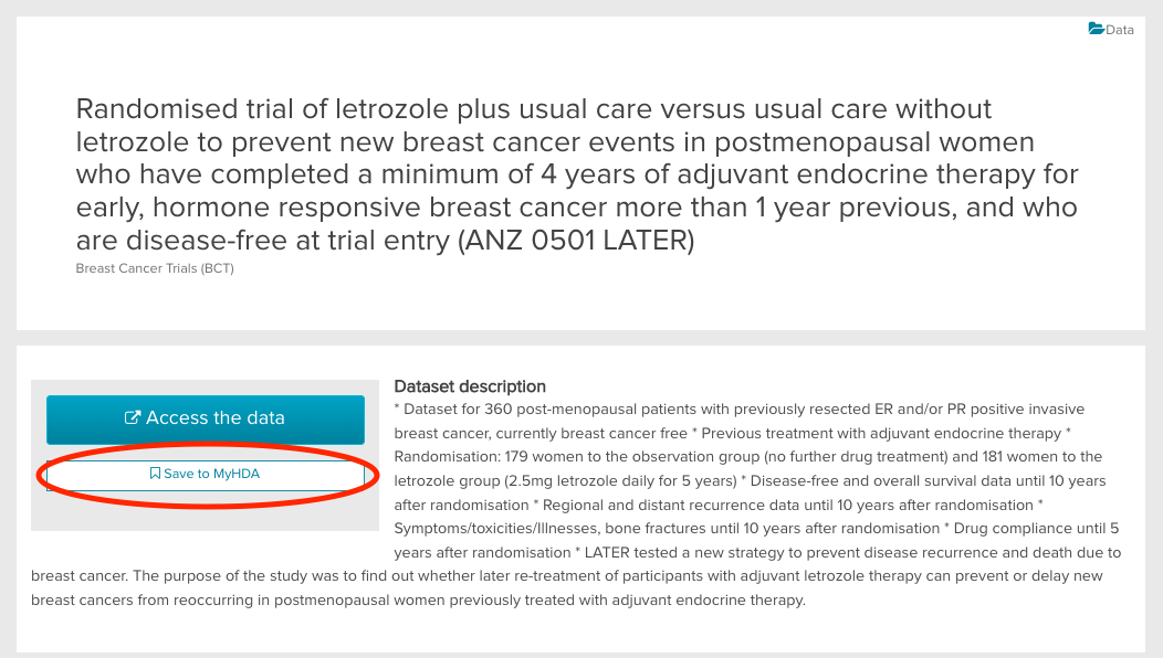 "My Saved Records" allows you to bookmark any health dataset that you're interested in and would like to come back to later. To save a record, simply click the "Save to MyHDA" button on the record view page.