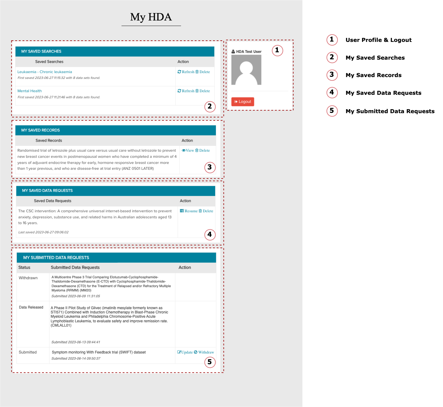 After logging in to Health Data Australia (HDA) using your AAF credentials, you'll gain access to your MyHDA user profile page and unlock the full functionalities of HDA. MyHDA comprises four sections: