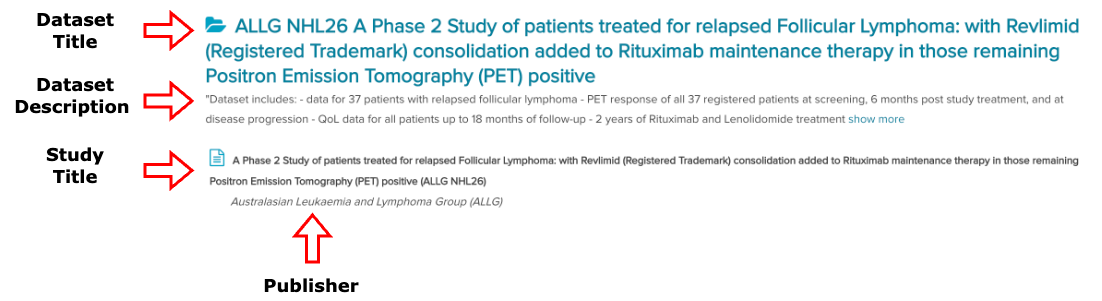 In addition to the dataset itself, the search result page in HDA will display other related information to help you better understand and evaluate the dataset. This includes the name of the publisher who created and provided the dataset, as well as the title of the related study that's been referenced by the dataset. The "search result components" section below provides an example of a returned search result.