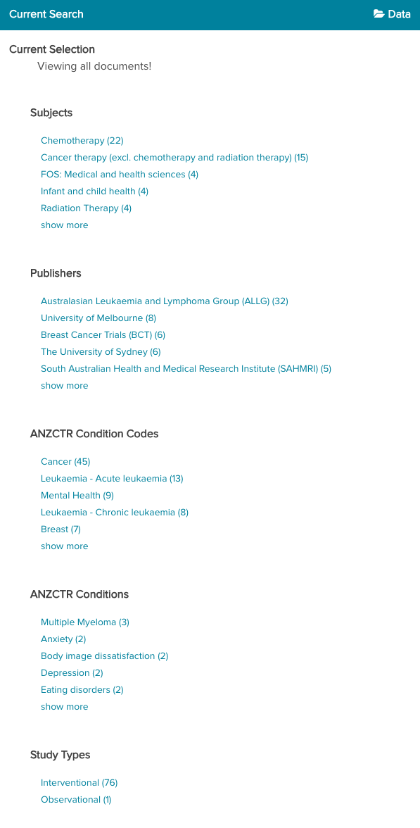 Only the top 5 filter entries are initially displayed in each section. If you wish to view additional filters, click the "show more" link. This action will expand the list to show all available filters. To minimise the list and display only the top 5 entries again, click the "show less" link.