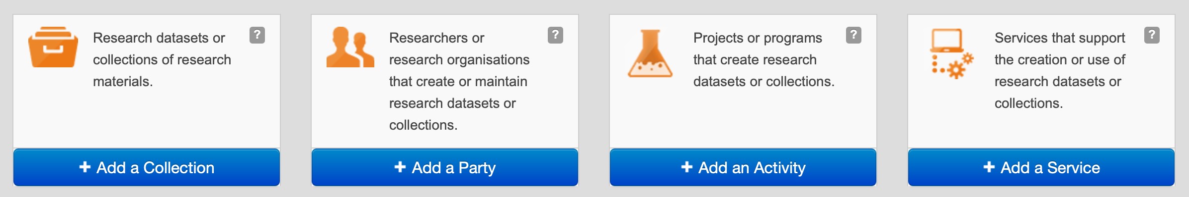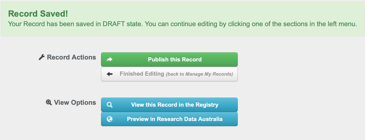 - Preview in Research Data Australia - Gives you the opportunity to preview how the record will be displayed in RDA before publication.