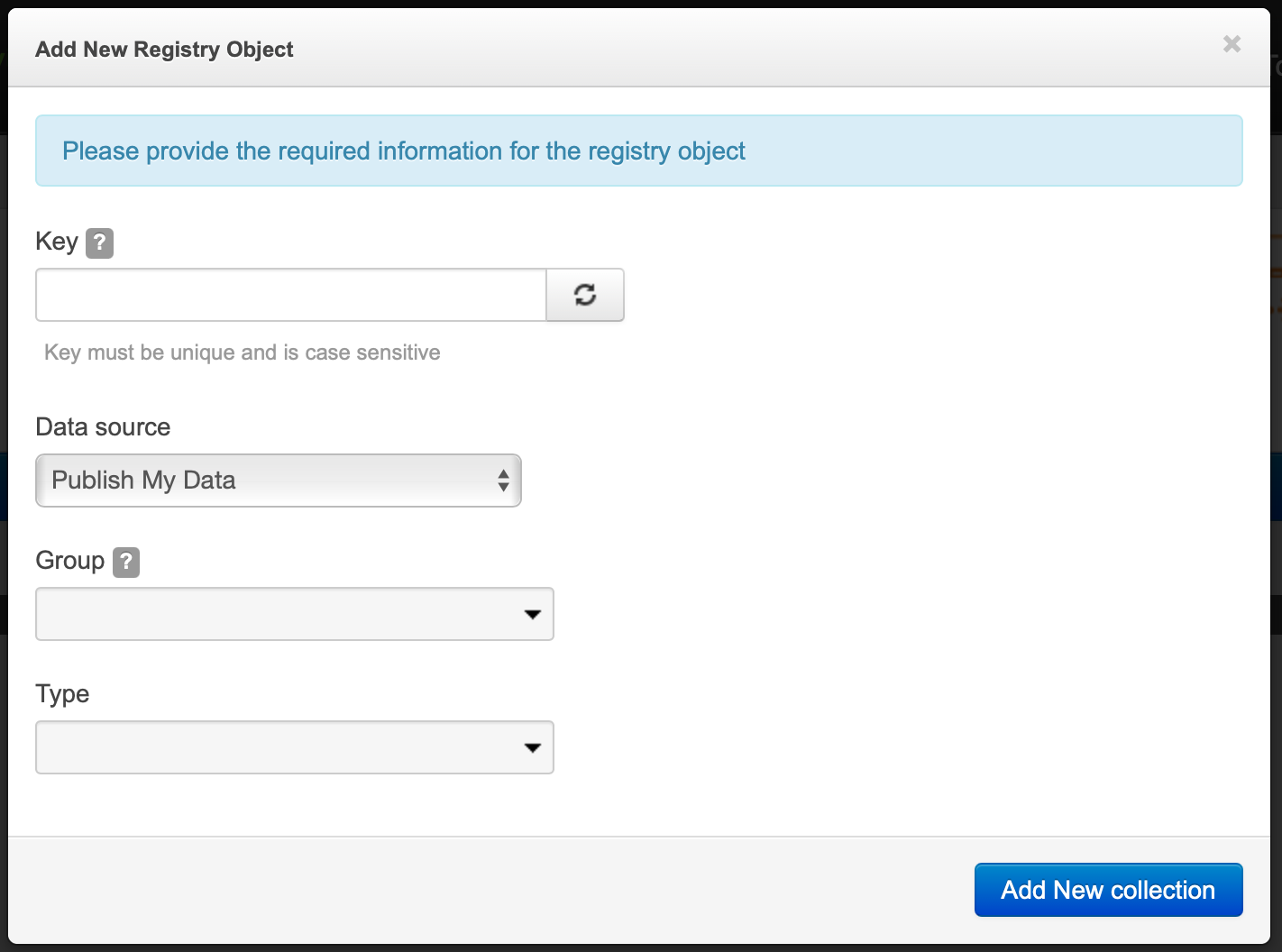 4. Click on 'Add New Collection' button. The record metadata entry form will be displayed.
