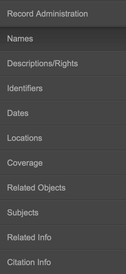 6. Navigate to each tab on the left to add the record metadata or you can click on either of these buttons