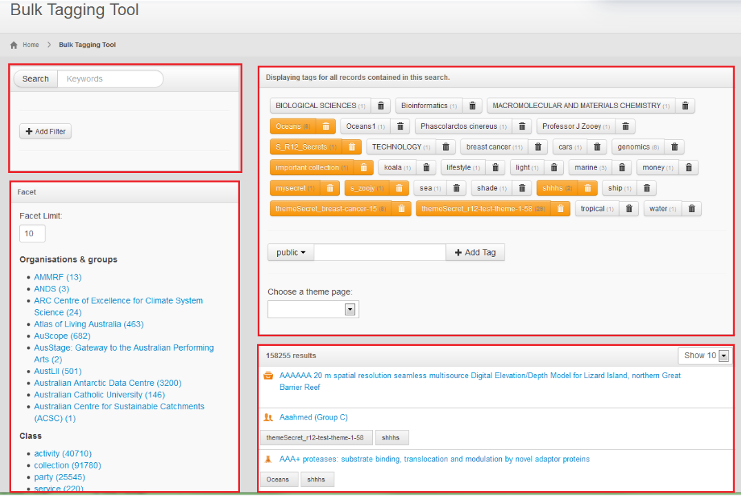 The Bulk Tagging Tool is a search interface that is made up of four sections or panes: