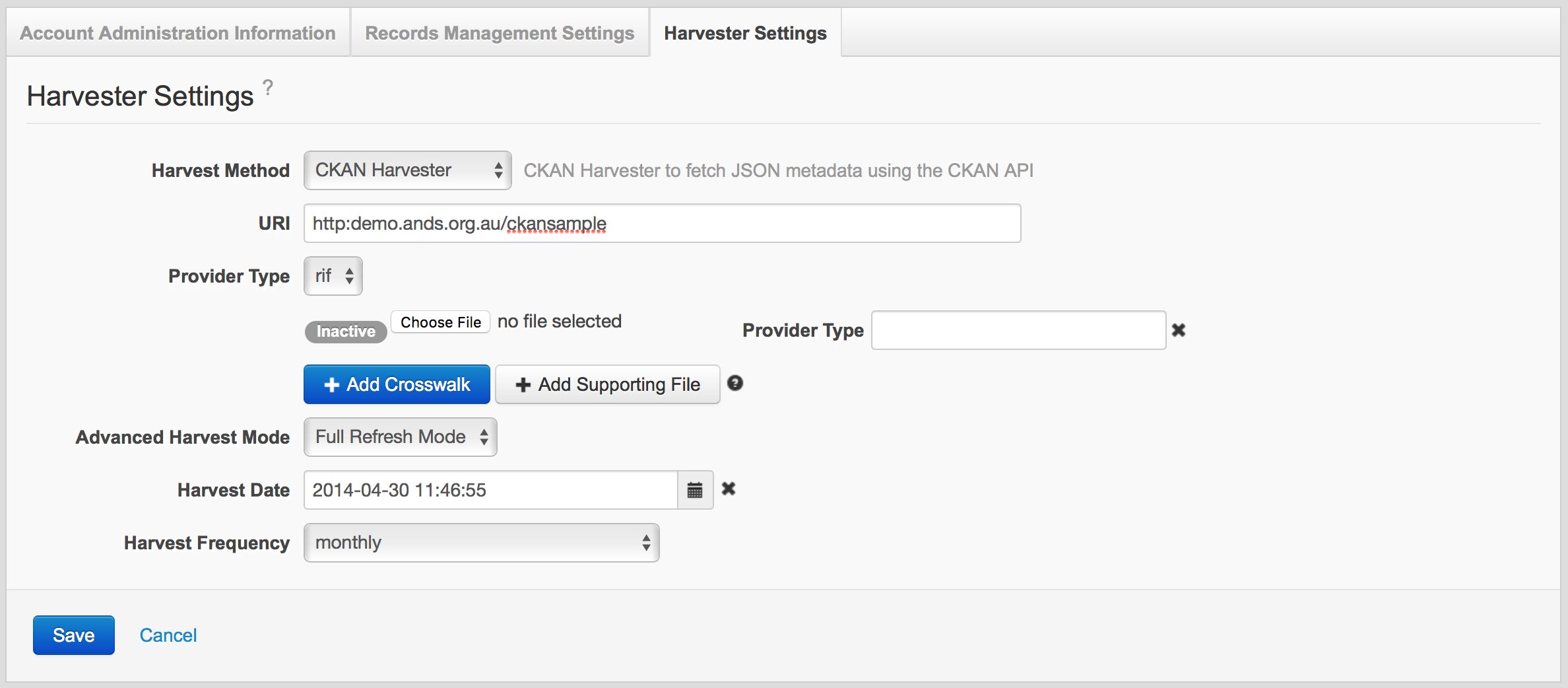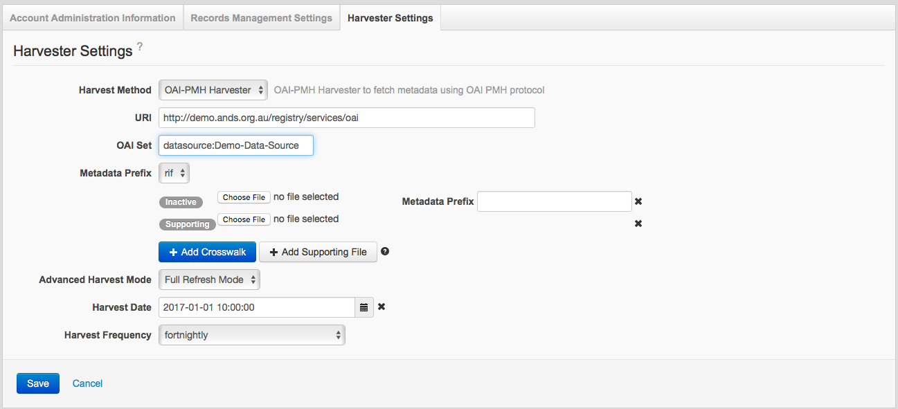 - JSONLD Harvester: (Custom method) A sitemap crawler that extracts JSON-LD content. Requires a URL pointing to a sitemap file, it can be text or xml (either <sitemapindex> or <urlset>). A default crosswalk from JSON-LD to RIF-CS will be run on import. This can be overwritten by adding your own crosswalk to the harvest settings.