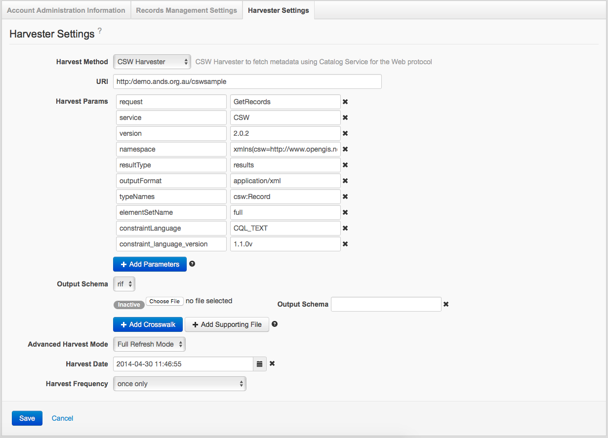 The 'Output Schema' drop down is available with a 'Harvest Method' of CSW. The drop down allows you to specify the ‘outputSchema’ parameter which is required by CSW service requests. The parameter specifies the return format for the CSW request and must be set to the URI of the output metadata schema (e.g. http://www.isotc211.org/2005/gmd).