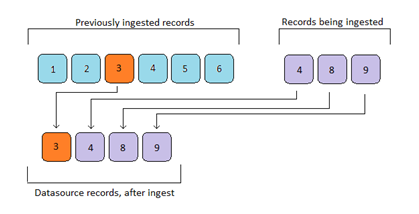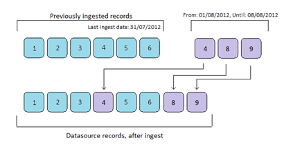 The above example shows that after ingest record 8 & 9 will be included into the data source, while the original record 4 will be replaced with the newly ingested record 4.This mode will only function if the harvest method is set to "OAI-PMH Harvester", and if the OAI-PMH provider correctly supports the "from and until" parameters as per the OAI-PMH Specification.