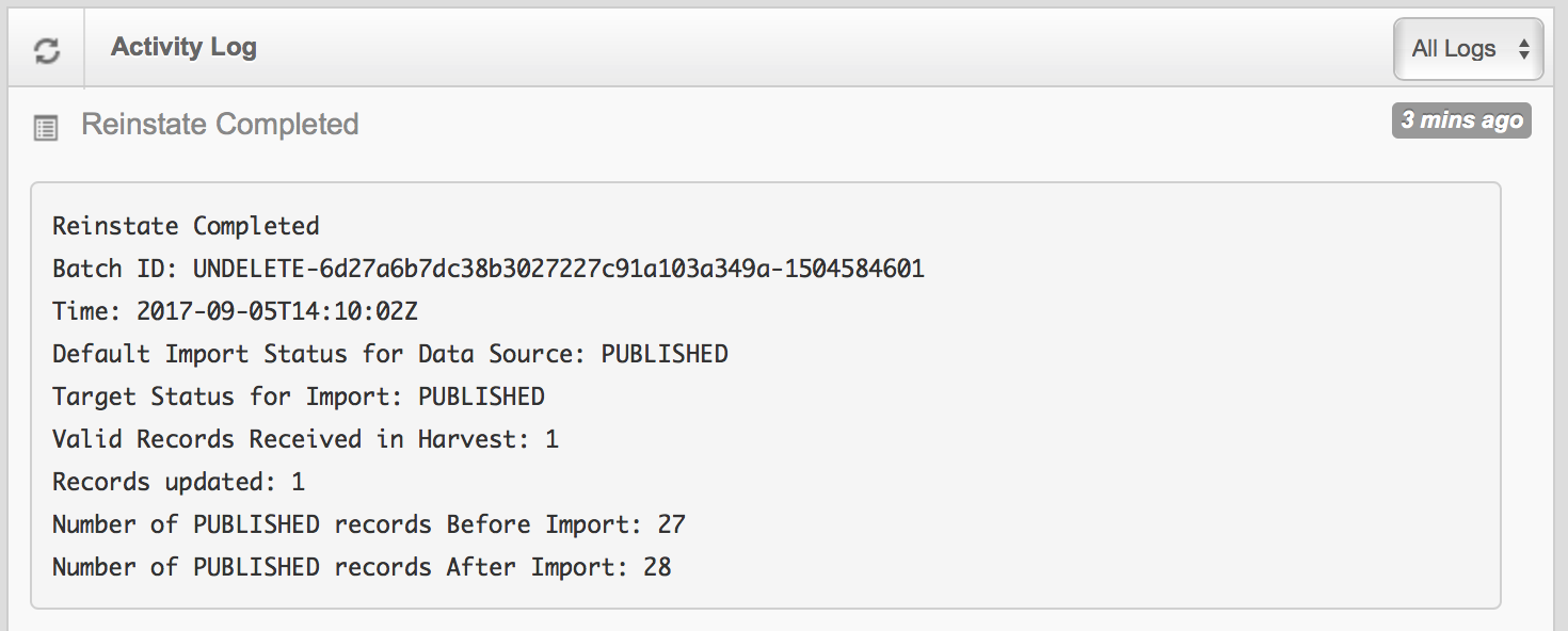 - Your Data Source Activity log will also be updated with a 'Reinstate Completed' entry:
