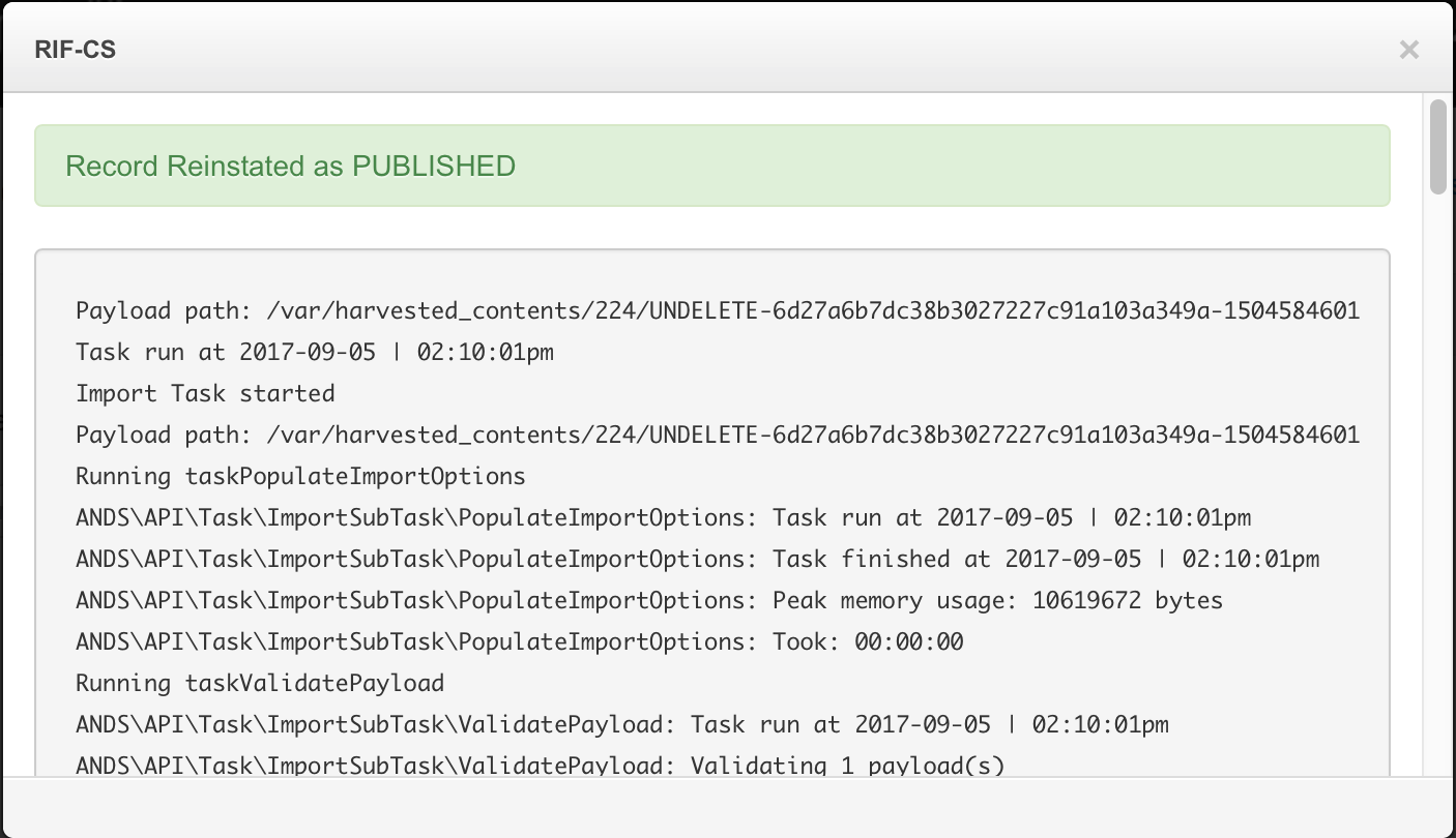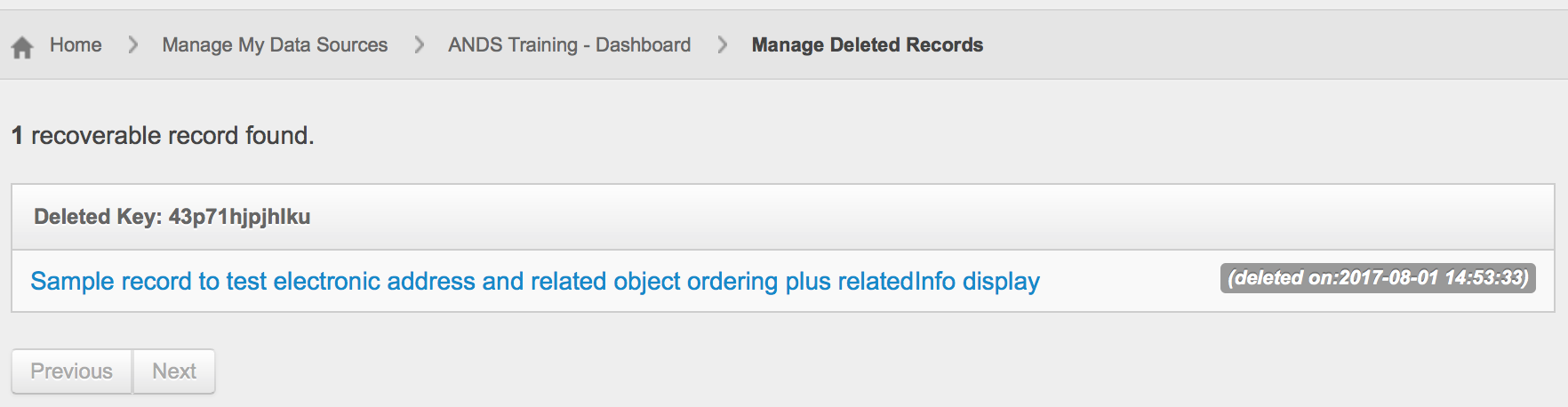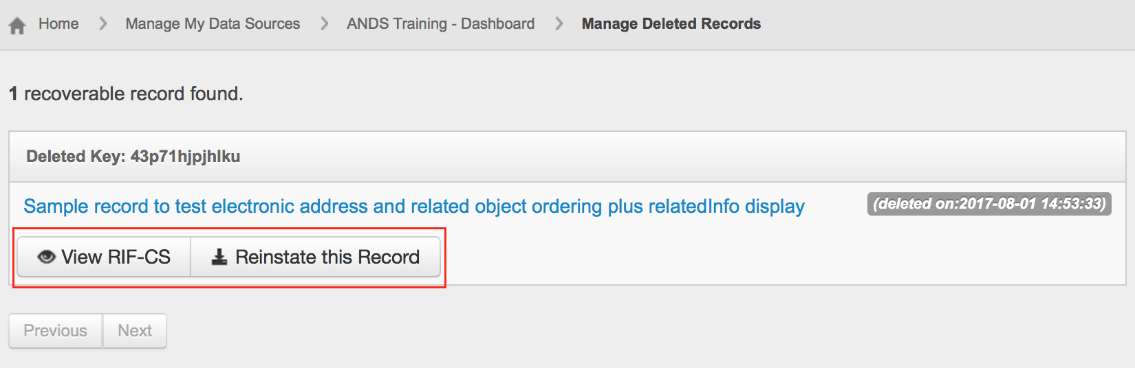 Reinstate this Record - the record will be reinstated as 'Published' and will be available in your Manage Records screen and also visible in Research Data Australia