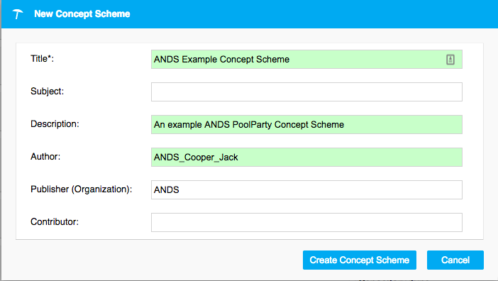 Your PoolParty username will automatically appear in the “Author” field. You may also enter information about vocabulary subjects, description, authors, publisher and contributor at this time or later.