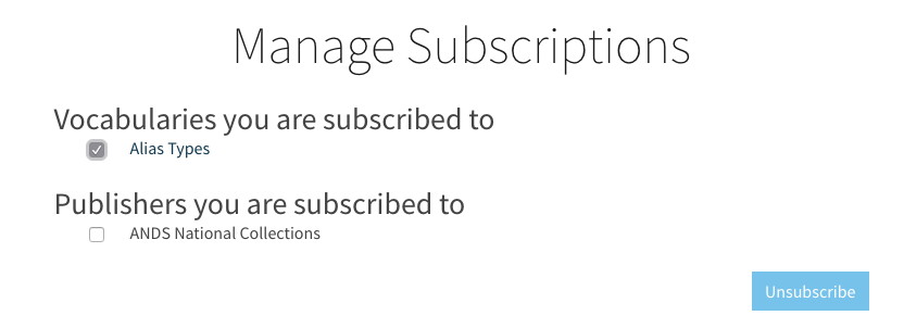 Users can manage their subscriptions via the Manage Subscriptions page in Research Vocabularies Australia. Access to the page is provided through a button/link embedded in weekly digest emails.