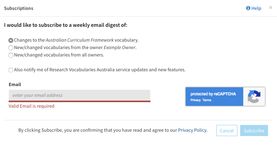 When subscribing to vocabularies, users also have the option of subscribing to the Research Vocabularies Australia service updates mailing list. Emails are sent to subscribers of this list as part of Research Vocabularies Australia software release communications. The emails are sent whenever software updates are released and contain details of the changes made to Research Vocabularies Australia.