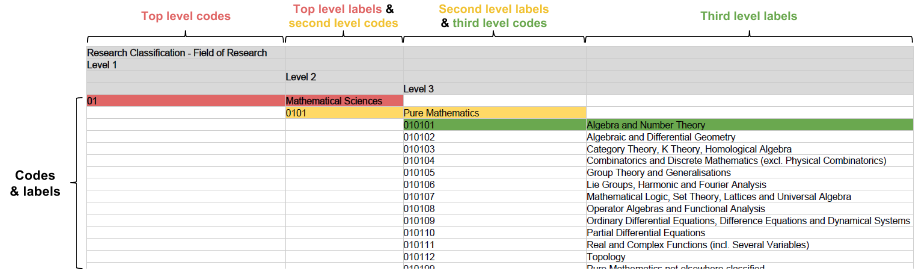 The ANZSRC-FOR vocabulary spreadsheet includes the title of the vocabulary, some column headings to explain how to read the spreadsheet (shown below in grey cells), names of vocabulary concepts, and codes that correspond to the concepts. This structure and code scheme is explained in detail by the Australian Bureau of Statistics here.