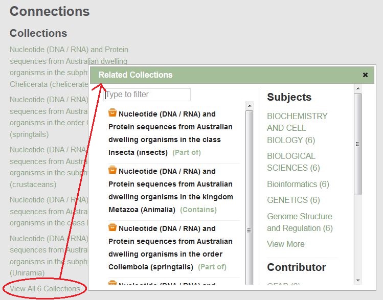 Previously, viewing a large number of connected records in the right-hand pane of a record in Research Data Australia was a tedious experience of scrolling and tabbing through multiple pages in a pop-up window. Now, the Connection Explorer provides a more user-friendly way to view, filter and navigate through long lists of connections.