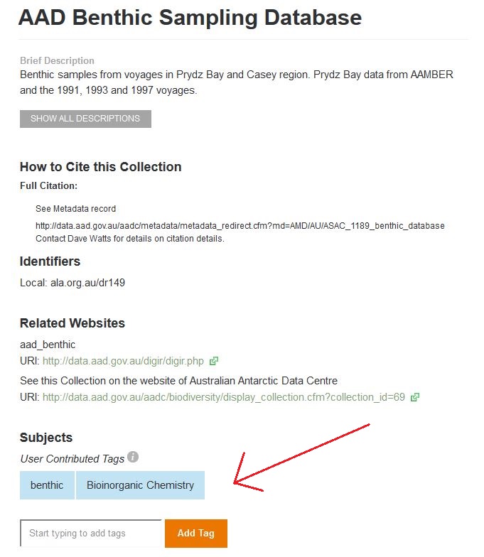 Users of Research Data Australia can annotate or tag a record with a word or phrase to assist discovery of these records by themselves and others. Clicking on these added tags will allow you to discover related records. You can add tags to a record by logging into Research Data Australia using your Facebook, LinkedIn, Twitter or Google profile.