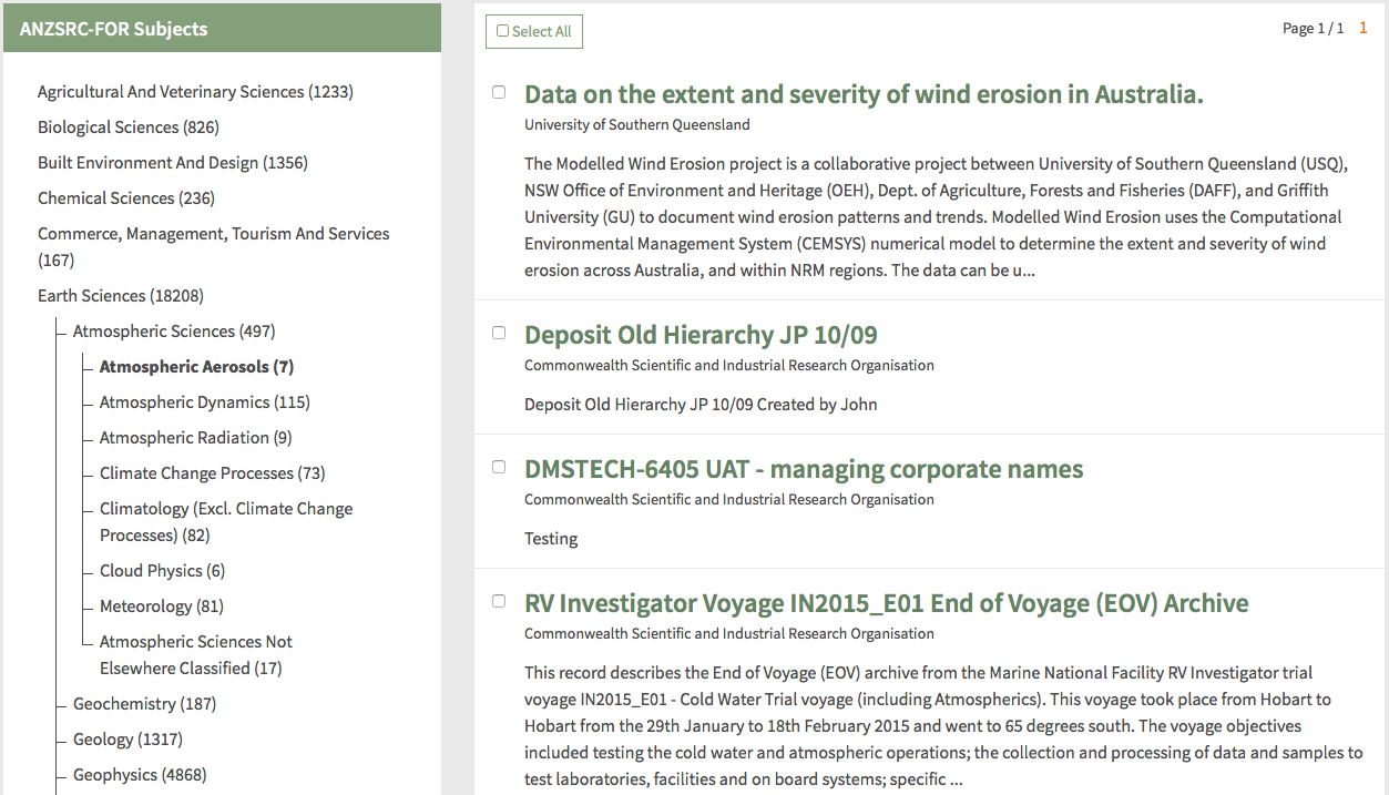 This release introduces an enhanced subject browse interface available from the Research Data Australia home page and the top menu of every page. A hierarchical subject tree makes browsing for datasets in particular subject areas much more intuitive. Users can select an area of interest from the tree (or the home page) and narrow their focus by selecting and expanding each node.